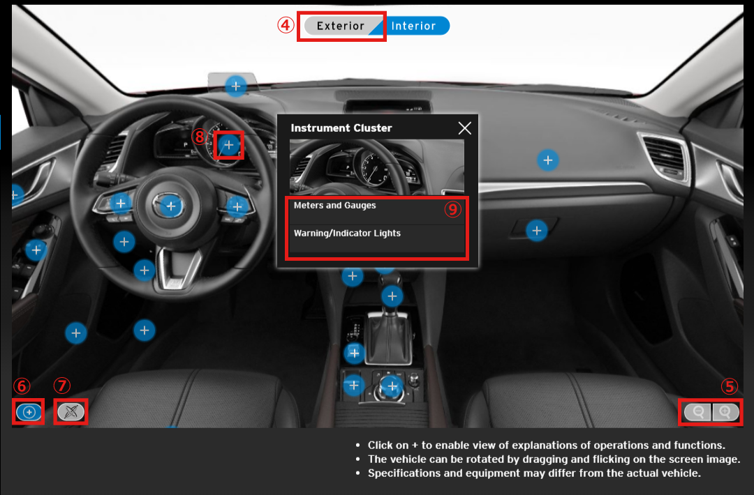 In addition, if you are using a mobile phone or other computer device which has a gyroscope function, the angles in the interior of the vehicle can be switched by moving the device (vehicle interior images only).