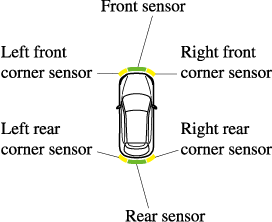 The position of a sensor which has detected an obstruction is indicated. The gauge illuminates in different areas depending on the distance to an obstruction detected by the sensor.