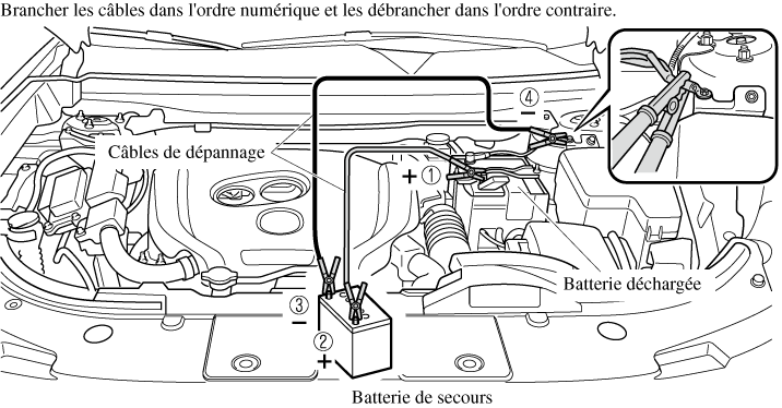 Le démarrage avec une batterie de secours est dangereux s'il n'est pas fait correctement. Suivre prudemment les instructions suivantes. Si l'on est pas certain de comment réaliser un démarrage avec une batterie de secours, s'adresser à un mécanicien compétent.