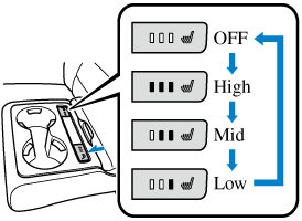 Press the seat warmer switch while the ignition is switched ON to operate the seat warmer. The indicator lights turn on to indicate that the seat warmer is operating. The mode changes as follows each time the seat warmer switch is pressed.