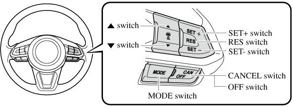 If your Mazda has the following steering switch, your Mazda is equipped with the Mazda Radar Cruise Control with Stop & Go function (MRCC with Stop & Go function) system.