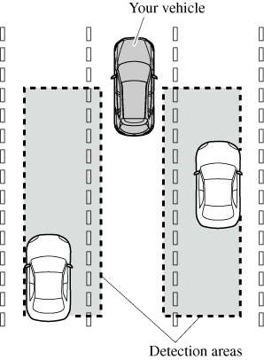 The detection area on this system covers the driving lanes on both sides of the vehicle and from the rear part of the front doors to about 50 m (164 ft) behind the vehicle.