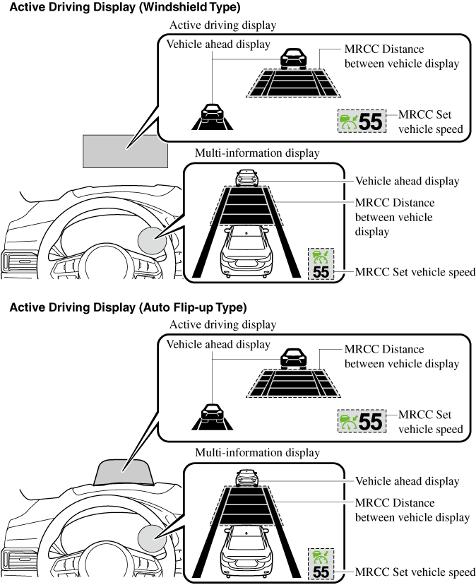 The Mazda Radar Cruise Control with Stop & Go function (MRCC with Stop & Go function) setting status and operation conditions are indicated on the multi-information display and the active driving display.