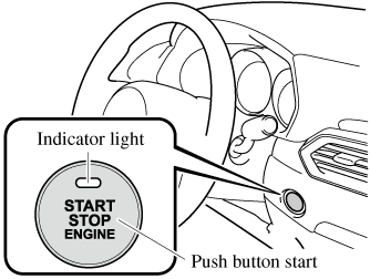 Press the push button start after both the KEY indicator light (green) (if equipped)in the instrument cluster and the push button start indicator light (green) illuminate.