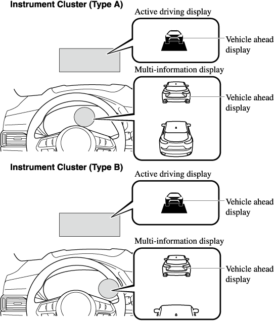 The DRSS operation status is indicated in the active driving display or multi-information display. Regarding malfunctions, check the vehicle conditions or have it inspected by an Authorized Mazda Dealer according to the content of the displayed message.