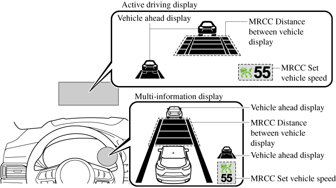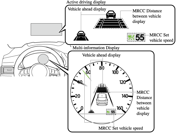 The MRCC with Stop & Go function setting status and operation conditions are indicated on the multi-information display and the active driving display.