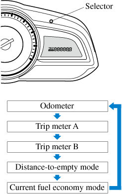 The display mode can be changed between trip meter A and trip meter B by pressing the selector while one of them is displayed. The selected mode will be displayed.