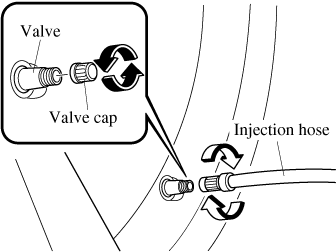 Make sure that the air compressor switch is off before inserting the air compressor hose to the injection valve of the bottle. If the air compressor hose is not installed to the injection valve of the bottle securely, the sealant may leak.