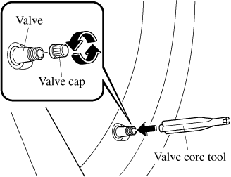 If there is air remaining in the tire when the valve core is removed, the valve core could fly out. Remove the valve core carefully.