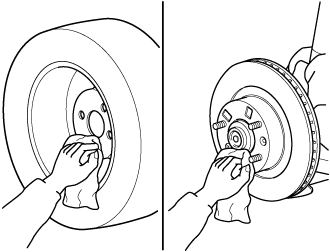 1. Remove dirt and grime from the mounting surfaces of the wheel and hub, including the hub bolts, with a cloth.