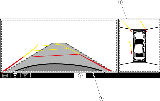 Displays the image of the area around the vehicle and the rear of the vehicle.