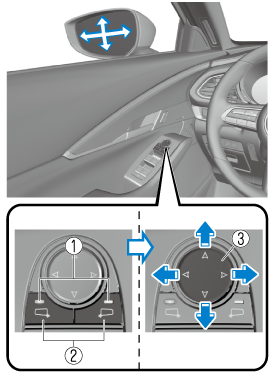 Press the select switch for the outside mirror to be tilted downward to turn on the indicator light of the select switch.