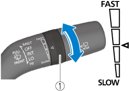 Rotate the switch upward (FAST direction) to shorten the interval time of the wiper operation, and rotate the switch downward (SLOW direction) to lengthen it.