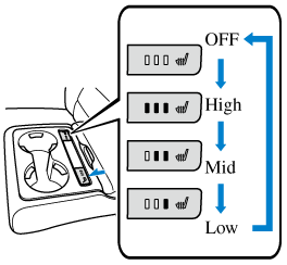 Press the seat ventilation switch while the ignition is switched ON to operate the seat ventilation. The indicator lights turn on to indicate that the seat ventilation is operating. The mode changes as follows each time the seat ventilation switch is pressed.