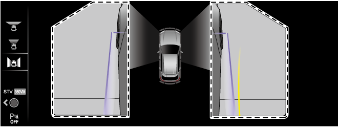 Displays an image of the front left and right sides of the vehicle together with the guide lines to assist in checking the front left and right sides of the vehicle when driving forward, parking, or stopping.