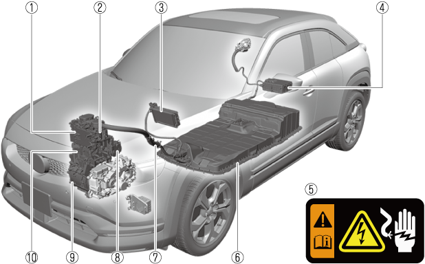 Le e-SKYACTIV EV comporte des parties sous haute tension et des parties sous haute température. Des étiquettes indiquant les précautions d'utilisation sont apposées sur ces parties. Toujours suivre les instructions figurant sur l'étiquette et utiliser le véhicule correctement.
