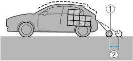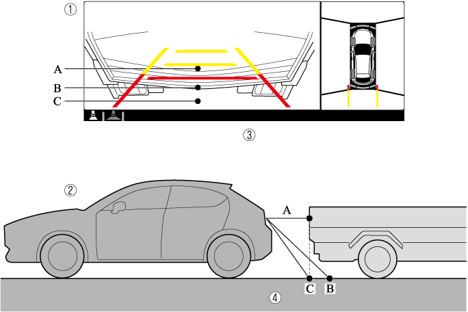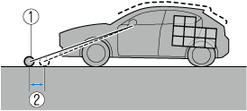 Étant donné que les lignes de guidage d’extrémité avant du véhicule ou les lignes de guidage de distance (caméra arrière) sont affichées sur la base d'une surface plane, la distance à l'objet en trois dimensions affichée sur l'écran est différente de la distance réelle.
