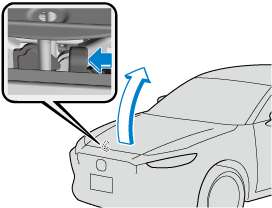 Passer la main dans l'ouverture du capot, faire glisser le loquet dans le sens de la flèche indiquée sur l'illustration, puis soulever le capot.