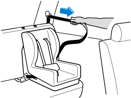 Placer le système de dispositif de sécurité pour enfants fermement sur le siège du véhicule. S'assurer que la ceinture se rétracte et serre le système de dispositif de sécurité pour enfants. Pendant que la courroie est enroulée, un déclic se fera entendre sur l'enrouleur lorsqu'il est en mode de blocage automatique. Si la ceinture ne bloque pas le système de dispositif de sécurité pour enfants fermement, répéter cette étape.