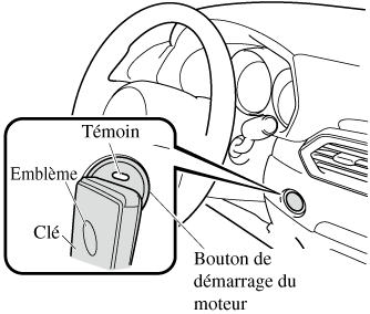 En cas d'anomalie avec la fonction du bouton de démarrage du moteur, le témoin du bouton de démarrage du moteur (ambre) clignote. Dans ce cas, il est possible que le moteur démarre, mais le faire inspecter dès que possible par un concessionnaire agréé Mazda.