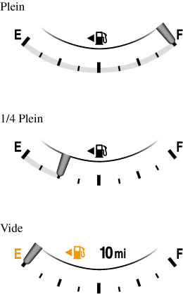 Après qu'on ait refait le plein de carburant, un certain temps pourra être nécessaire avant que l'indicateur se stabilise. En outre, il est possible que l'indicateur dévie lors de la conduite sur une pente ou dans un virage, en raison des mouvements du carburant à l'intérieur du réservoir.