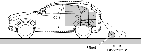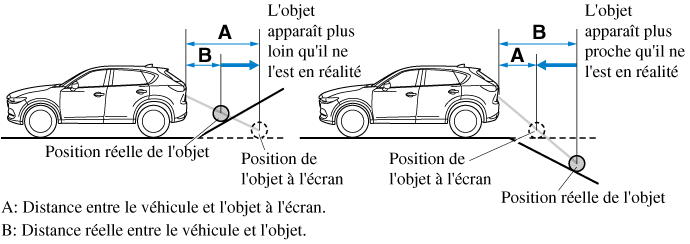 Lorsqu'il y a une pente raide montante (ou descendante) derrière le véhicule, l'objet affiché à l'écran apparaît plus loin (ou plus près en cas de pente descendante) qu'il ne l'est en réalité.