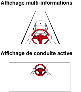 Si vous retirez vos mains du volant, un avertissement apparaît sur l'affichage multi-informations et l'affichage de conduite active. Ensuite, si vous continuez de ne pas tenir le volant, un avertissement apparaît sur l'affichage multi-informations et l'écran de conduite actif et un avertissement sonore retentit.