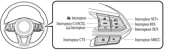 Lorsque l'interrupteur CTS est enfoncé alors que le système de régulation de la vitesse à radar Mazda avec fonction Stop & Go (MRCC avec fonction Stop & Go) est en marche, la CTS fonctionne. De plus, lorsque l'interrupteur MRCC est enfoncé alors que la CTS est en marche, le système de régulation de la vitesse à radar Mazda avec fonction Stop & Go (MRCC avec fonction Stop & Go) fonctionne.