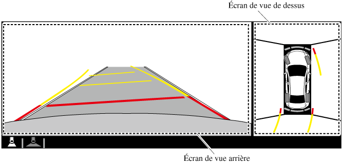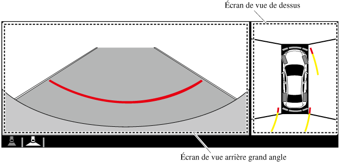 Affiche une image de la zone autour du véhicule et de l'arrière du véhicule (zone large).