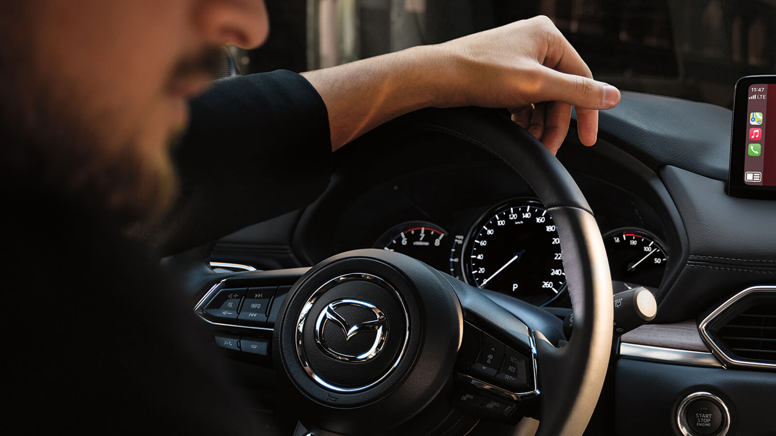 Close-up of a person driving a Mazda CX-5 with one hand on the steering wheel, focused on the road.;