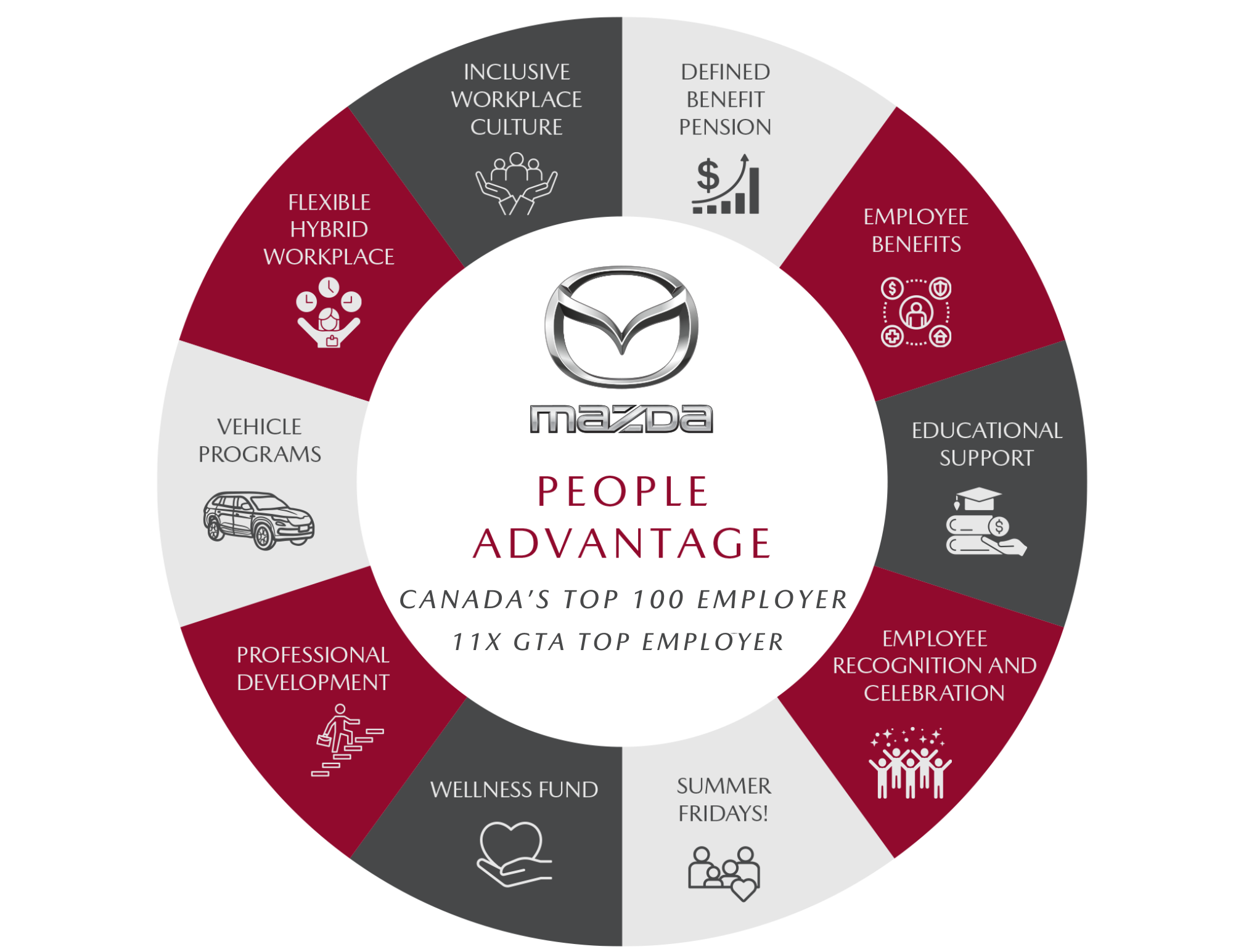 At Mazda Canada, our people are at the heart of everything we do. That's why we are proud to display our Mazda People Advantage Wheel. This wheel demonstrates our unique and differentiated employee experience that all points to our strong internal culture. Thank you to our employees who uphold our values and contribute to our positive workplace!