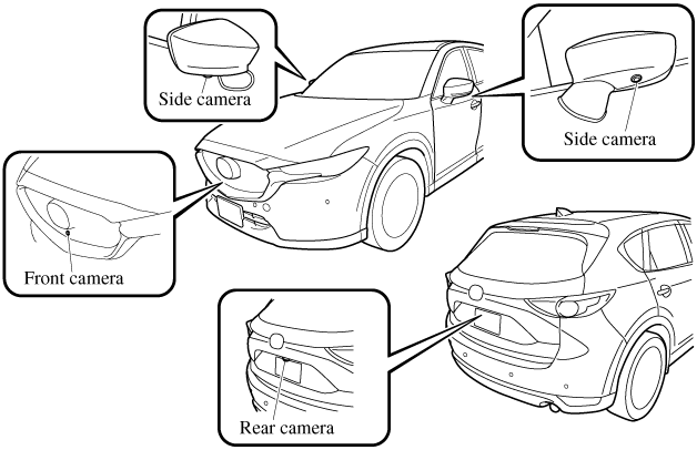 Your vehicle is equipped with a front camera, side cameras, and a rear camera. The 360° View Monitor uses each camera.