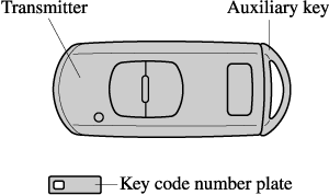 A code number is stamped on the plate attached to the key set; detach this plate and store it in a safe place (not in the vehicle) for use if you need to make a replacement key (auxiliary key).