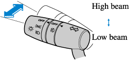 The headlights switch between high and low beams by moving the lever forward or backward.