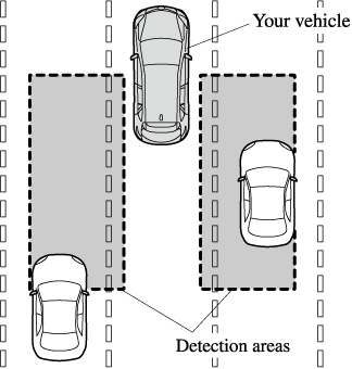 The detection area on this system covers the driving lanes on both sides of the vehicle and from the rear part of the front doors to about 50 m (164 ft) behind the vehicle.