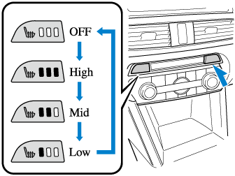 Press the seat warmer switch while the ignition is switched ON to operate the seat warmer. The indicator lights turn on to indicate that the seat warmer is operating. The mode changes as follows each time the seat warmer switch is pressed.
