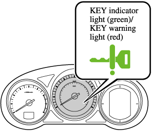 If the KEY warning light (red) illuminates, or the push button start indicator light (amber) flashes, this could indicate a problem with the engine starting system. This may prevent the engine from starting or from switching the ignition to ACC or ON (for vehicles with a type A instrument cluster (Search), messages are displayed in the instrument cluster). Have your vehicle inspected at an Authorized Mazda Dealer as soon as possible.