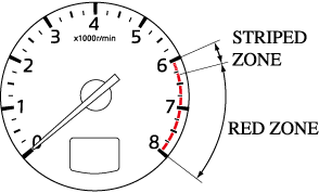 When the tachometer needle enters the STRIPED ZONE, this indicates to the driver that the gears should be shifted before entering the RED ZONE.