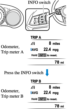 The trip meter and average fuel economy can be reset by pressing the INFO switch for 1.5 second or more while in each mode.