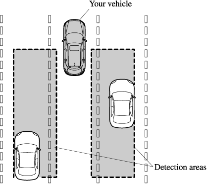 The detection area on this system covers the driving lanes on both sides of the vehicle and from the rear part of the front doors to about 50 m (164 ft) behind the vehicle.