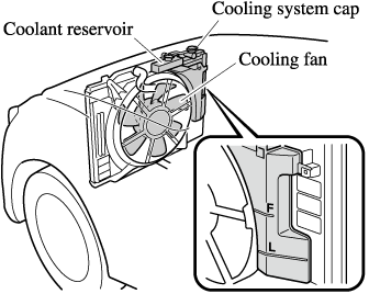If the cooling fan does not operate while the engine is running, the engine temperature will increase. Stop the engine and call an Authorized Mazda Dealer.