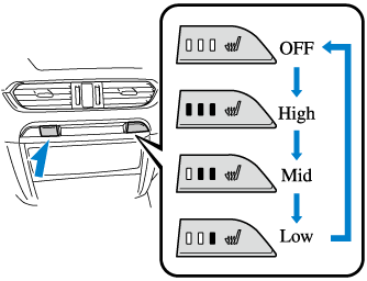 Press the seat warmer switch to illuminate the indicator light while the ignition is switched ON. The mode changes as follow each time the seat warmer switch is pressed.