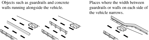 The Blind Spot Monitoring (BSM) warning indicator light may turn on and the vehicle detection screen may be displayed in the display in reaction to stationary objects (guardrails, tunnels, sidewalls, and parked vehicles) on the road or the roadside.