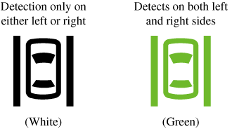 The Lane-keep Assist System (LAS) & Lane Departure Warning System (LDWS) indication is white when the system detects only a white (yellow) line on either the left or right, and the indication changes to green when the system detects white (yellow) lines on both the left and right sides.