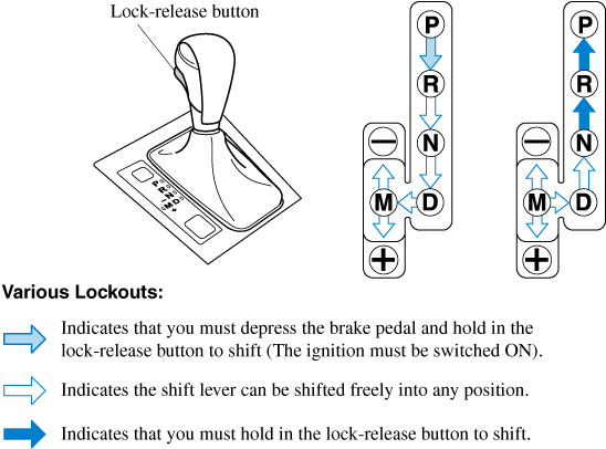 The Sport AT has an option that is not included in the traditional automatic transaxle that gives the driver the option of selecting each gear instead of leaving it to the transaxle to shift gears. Even if you intend to use the automatic transaxle functions as a traditional automatic, you should also be aware that you can inadvertently shift into manual shift mode and an inappropriate gear may be retained as the vehicle speed increases. If you notice the engine speed going higher or hear the engine racing, confirm you have not accidentally slipped into manual shift mode (Search).