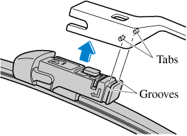 2. Slide the blade component in the direction of the arrow while pressing the wiper arm tab to remove the blade component from the wiper arm.
