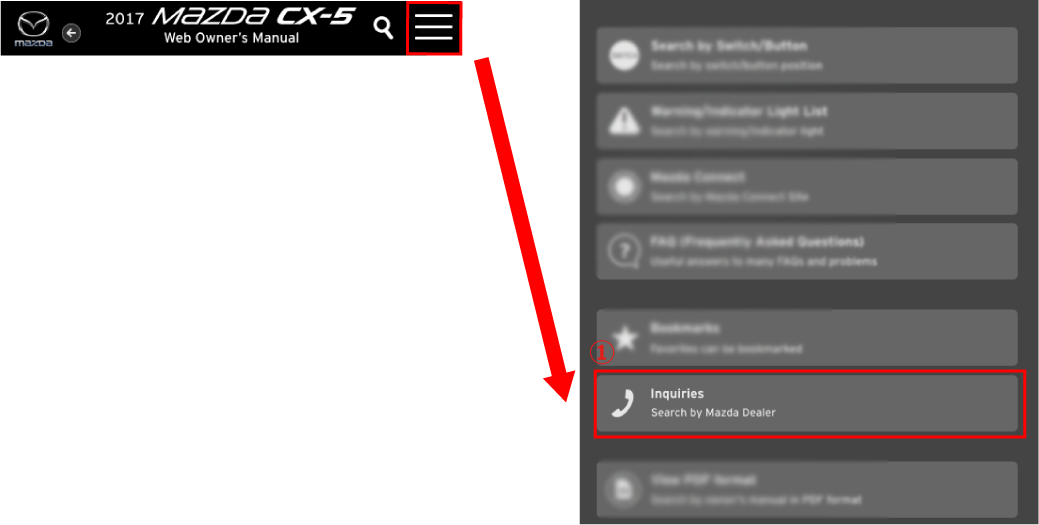 The search engine for Mazda Dealers is displayed when selecting Inquiries from the menu.