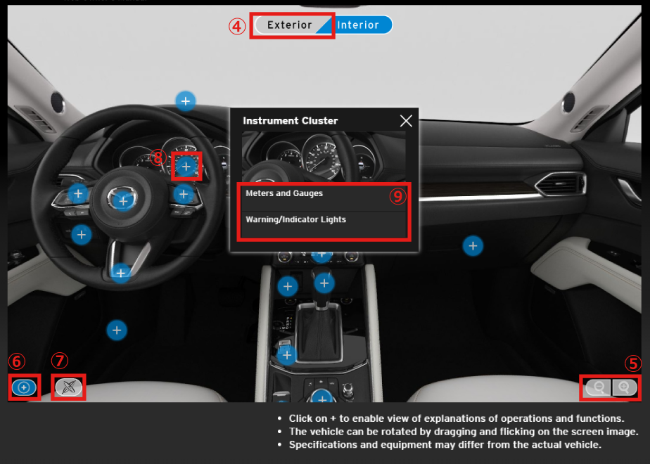In addition, if you are using a mobile phone or other computer device which has a gyroscope function, the angles in the interior of the vehicle can be switched by moving the device (vehicle interior images only).