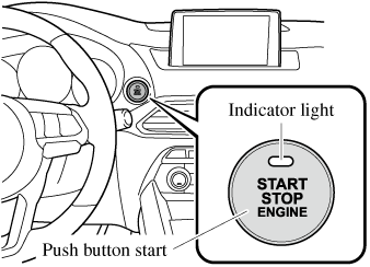 If there is a malfunction with the push button start function, the push button start indicator light (amber) flashes. In this case, the engine may start, however, have the vehicle checked at an Authorized Mazda Dealer as soon as possible.