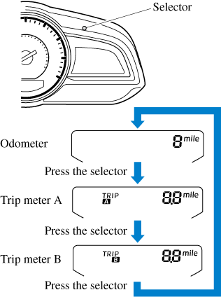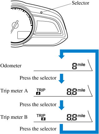The display mode can be changed from odometer to trip meter A to trip meter B and then back to odometer by pressing the selector while one of them is displayed. The selected mode will be displayed.